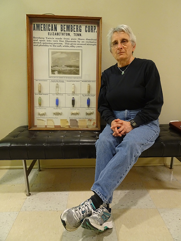 Above: Dr. Tedesco with another item from the Reece Museum collections: A poster produced by the Bemberg Corporation detailing the rayon production process.