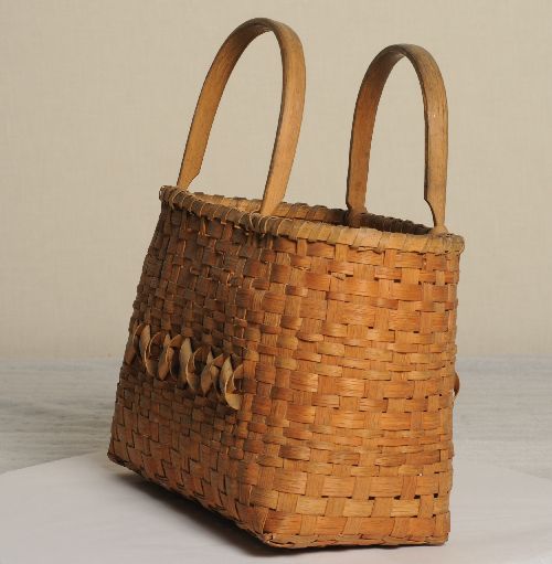 The Eastern Band of Cherokee are well known for their double weave basket designs and many of their master artists have exhibited their works all over the world. For many years, river cane was the primary material used for Cherokee basketry. By the mid-20th century, with the scarcity of river cane, the Cherokee began making oak and later honeysuckle baskets. This oak basket has a faded brown and red design, probably made from walnut and bloodroot dyes. The basket was likely made for the tourist trade.