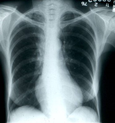 Her chest x-ray and a photo of her arm lesion are shown below.