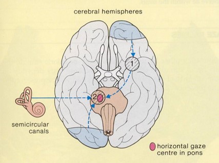 to the left, the eyes deviate fully to the right demonstrating intact pontine reflexes