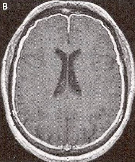 Dural thickening (white margin) is evident in this MRI of the brain.