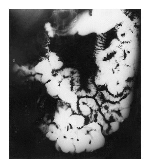 and the results of a barium-enema examination of the small bowel (Panel D) are shown
