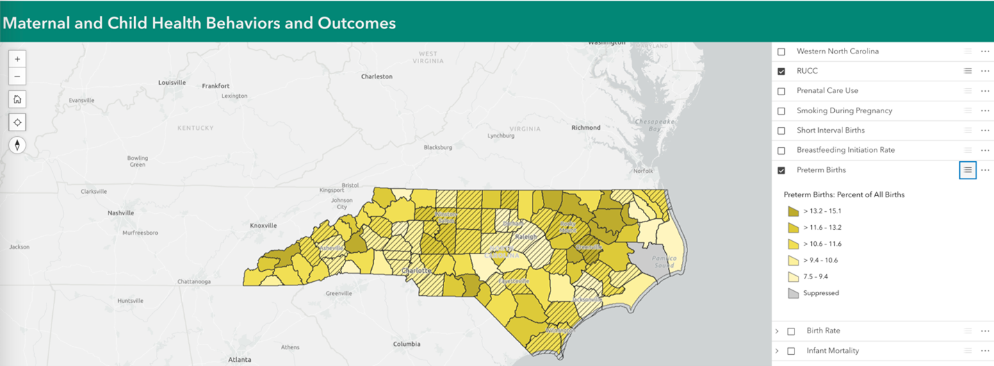 The North Carolina Maternal and Child Health Dashboard is a geographic information system (GIS) tool that brings together many sources of public and semi-public data to display Maternal and Child Health outcomes and social determinants of health across North Carolina, with particular emphasis on Western North Carolina. Specifically, the dashboard is focused on income measures, and lesser studied social determinants of health including transportation, healthcare access points, and access to broadband. The dashboard is intended to be used as a community resource as well as a tool to inform public health policy and practice. This work was funded by the Dogwood Health Trust.