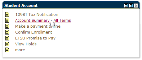 Your Account Summary is a financial summary of all charges, payments and credits to your account for each semester you've been a student here at ETSU.