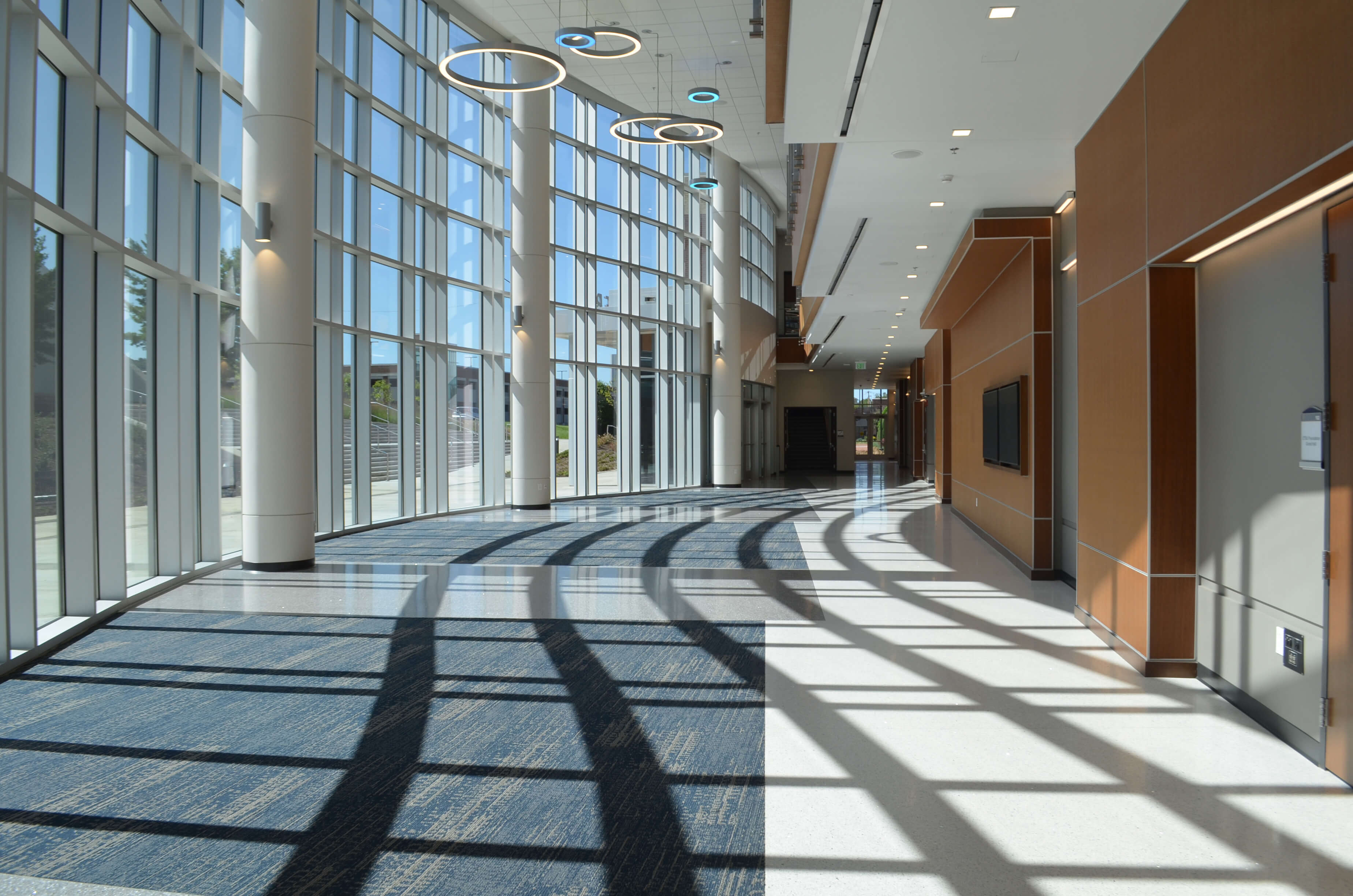 The Tindall Lobby is a bright and spacious area with a soaring glass curtain wall.