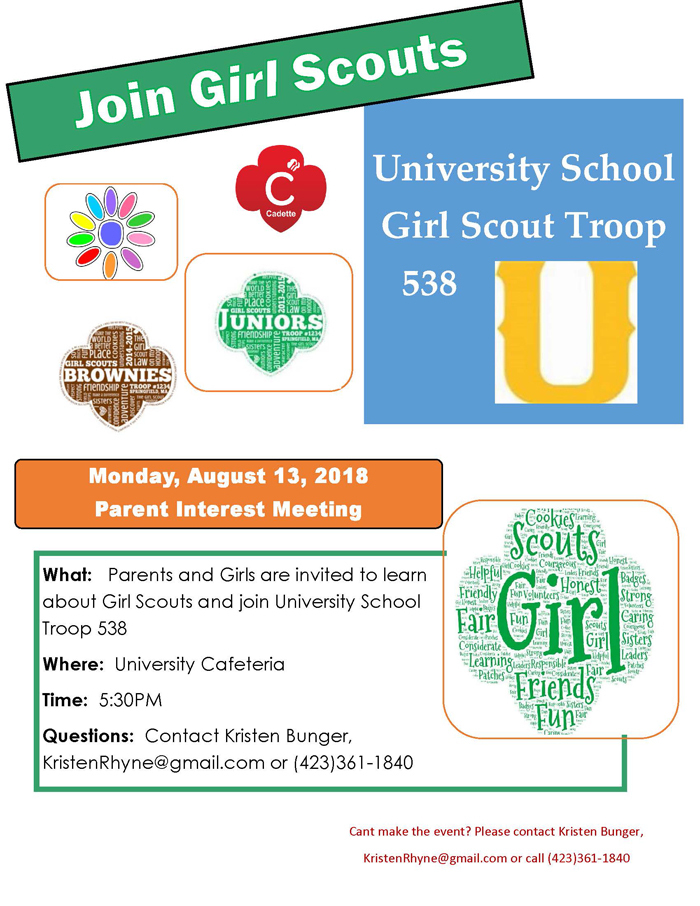 My name is Kristen Bunger (2nd grade Finley Bunger’s mom) and I am the troop administrator for University School Girl Scout Troop 538. I wanted to send this email and flyer to invite parents and/or guardians to Troop 538’s Girl Scout Parent Interest Night. Troop Season 2018-2019 Parent Interest Night will be Monday, August 13th at 5:30 p.m., in the University School Cafeteria. We will cover information about Girl Scouts and joining our troop.